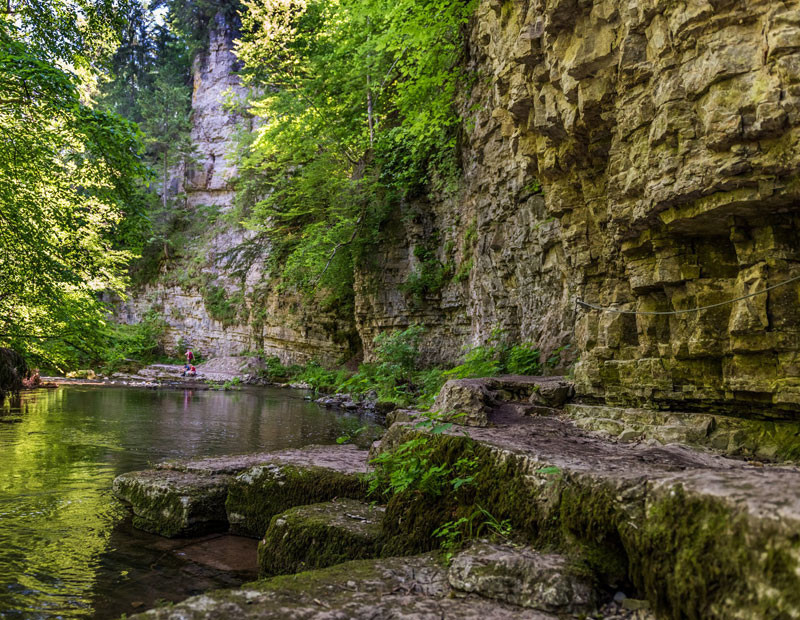 Gemütliche Talauen, schmale, teils felsige Steige mit Leitern und Treppen an senkrechten Felswänden, Felsgalerien, Pfade direkt am Wasser